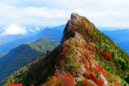 弥山から岩場の稜線を10〜15分ほど歩きます(非常に狭く危険なため、天候や装備に要注意)